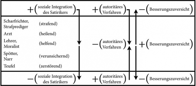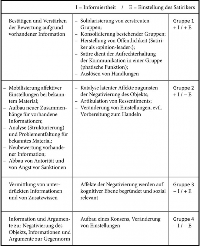 Satirische Kommunikation ist innerhalb der institutionalisierten Handlungen literarischer Kommunikation durch eine besondere Funktionalisierung von textuellem System und außertextuellen Bezügen gekennzeichnet, die für die Textstruktur Relevanz hat. Sie lässt sich im Hinblick auf die spezifische Interaktion von prinzipiellen Elementen der literarischen Kommunikation (Autor, Gegenstand, Rezipient, Normbezug) beschreiben und ist in der Lebenspraxis durch eine besondere Einstellung der Individuen gekennzeichnet, die am Kommunikationsprozess beteiligt sind. Die systematische Beschreibung dieser Interaktionen liefert ein Raster, mit dessen Hilfe sich sowohl die Texte (als Grundlage der Kommunikationshandlungen) und die Kommunikationsabläufe (mit ihren Intentionen und Wirkungen) als auch unterschiedliche Konstellationen in der Gleichzeitigkeit sozialer Kontexte und in den historischen Entwicklungen analysieren lassen.
