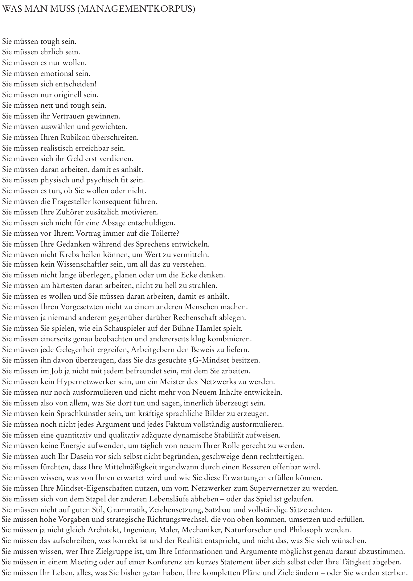 Ursprung des Textmaterials ist in diesem Falle – wie auch die eingeklammerte Angabe im Titel hervorhebt – ein Korpus von acht Management- bzw. Karriereratgebern. Bajohr sortiert für das Gedicht Sätze, die mit »Sie müssen« beginnen, aufsteigend nach ihrer Länge (vgl. HZ, S. 14). Das Ergebnis ist ein gleichermaßen zynisch-kritisches wie literaturtheoretisch interessantes Gedicht (vgl. Abb. 1):